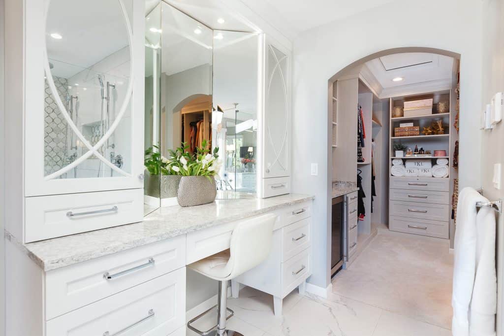 The picture second picture shows a Rochester Hills bathroom remodel where we knocked down wall and expanded the space to a large bathroom with a seated makeup area. The homeowner now has plenty of room to move around and get ready for the day. We won the Best of Houzz Design Award for this bathroom.