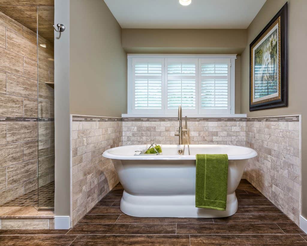The second picture shows a Shelby Township bathroom remodeling project of ours. We got rid of a dated and bulky bathtub that took up way too much room and replaced it with the beautiful free-standing tub that you see here. We also tiled the floor with a wood-looking tile and sectioned off an area for the shower. This bathroom truly is stunning.